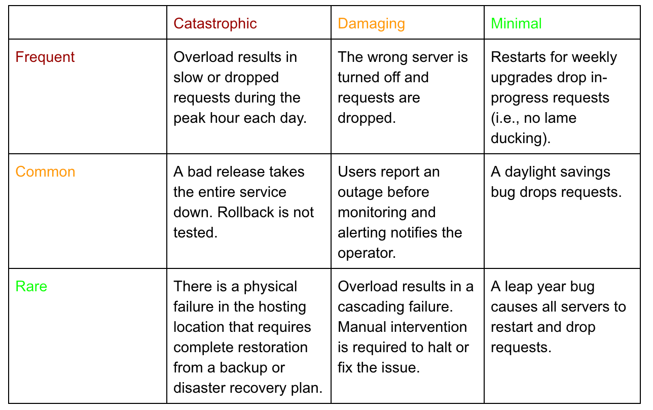 This may sound orthogonal to agile practices but the idea is not to achieve perfection but rather to define a Minimum Operable Product. It’s also designed to identify unexpected operating scenarios and better plan for them. This research is done with the engineers of the product and the result is to determine an assessment on two axis — likelihood and impact.